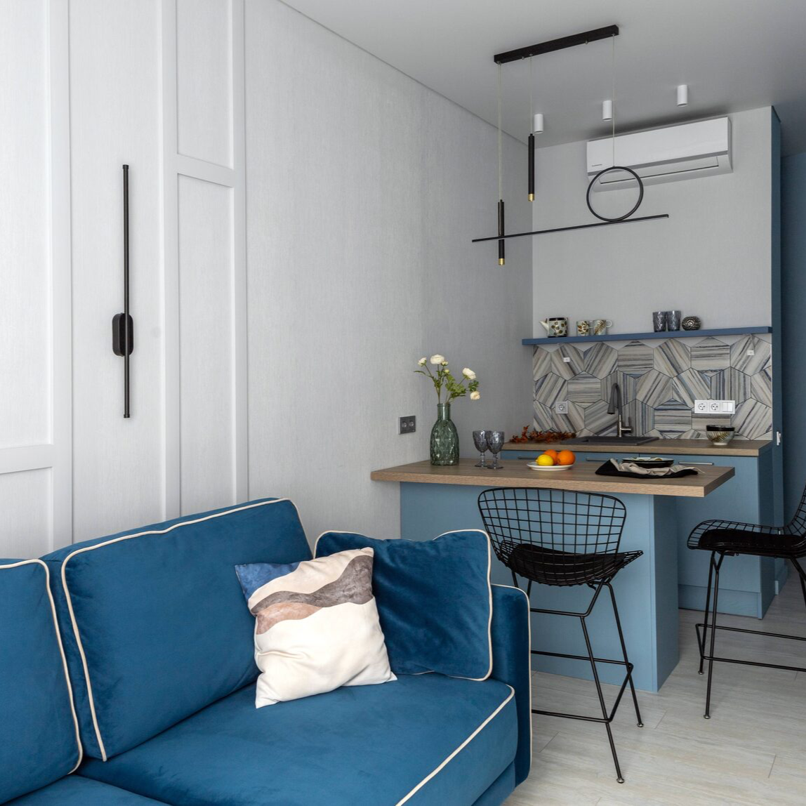Эта стильная студия выполнена в сине-голубой гамме, создающей атмосферу зимней сказки и вдохновения. Здесь вы сможете насладиться тишиной и комфортом, идеальными для расслабляющего отдыха.